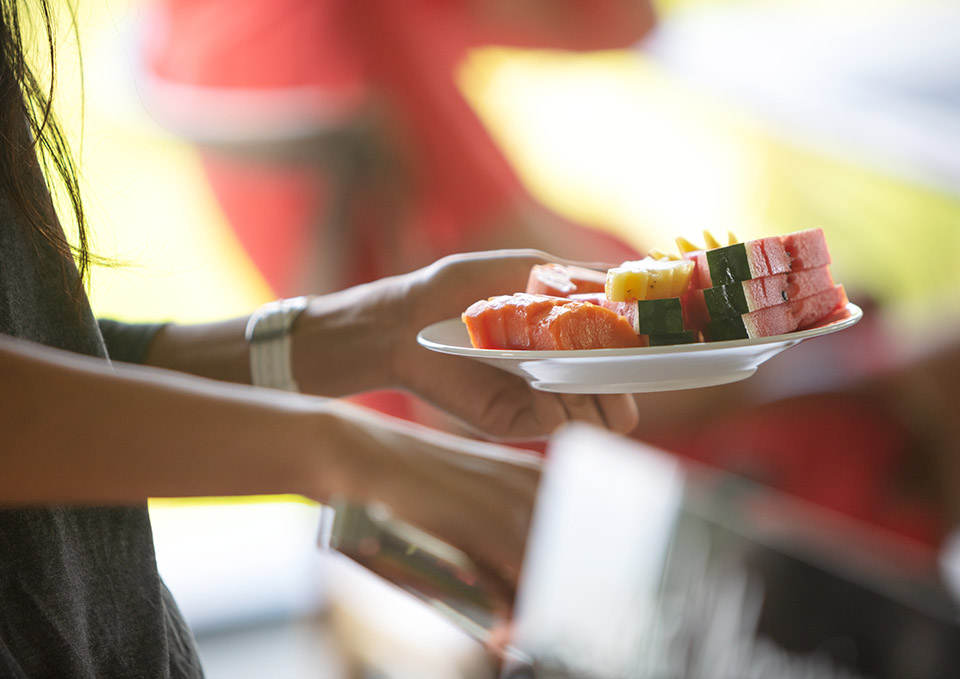 Selection of cakes, fresh seasonal fruit, coffee and tea
