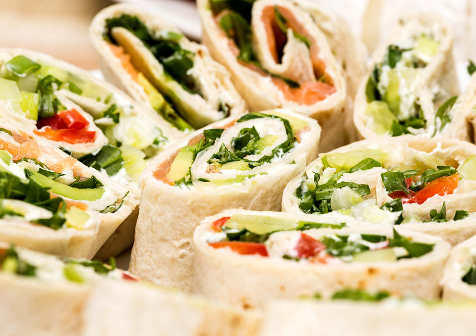 - Rolled tortillas with charred vegetables and basil pesto (v)