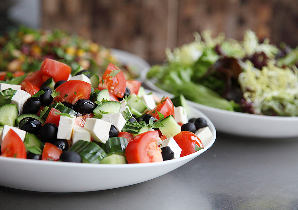 > Platters served to your table | Accompanied with crusty dinner rolls and Greek salad with olives and feta